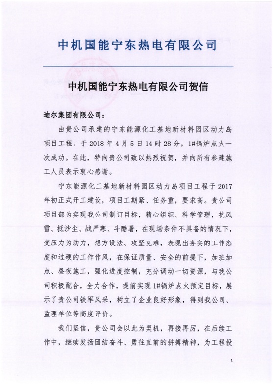 中機國能寧東熱電有限公司賀信