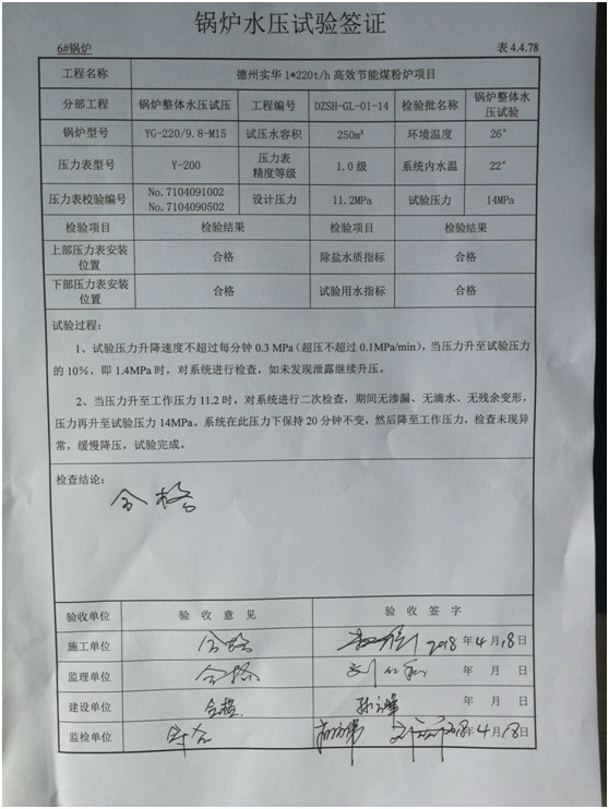 2018年04月18日下午15點43分,由二公司承建的德州實華化工有限公司集中供熱項目安裝工程,在德州市特檢院專家、業(yè)主及監(jiān)理的現(xiàn)場見證下,6#鍋爐水壓試驗一次成功。