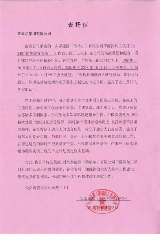 表揚信:第一公司內蒙久泰三臺鍋爐相繼點火吹管成功
