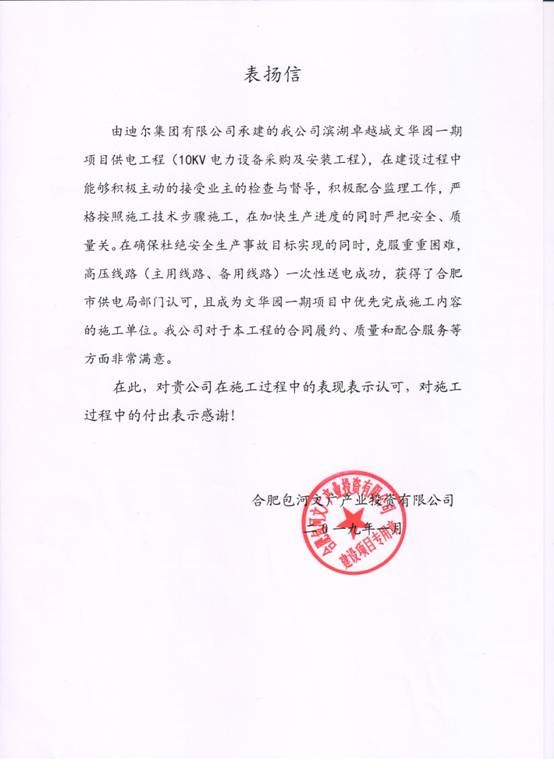 安徽文華園配電工程業主表揚信