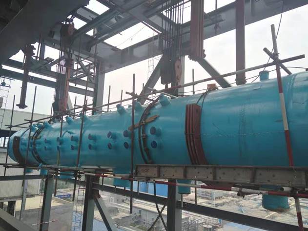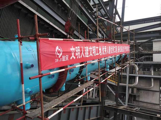 2019年6月19日11時(shí),太陽宏河項(xiàng)目部1400T堿回收鍋爐汽包吊裝就位。