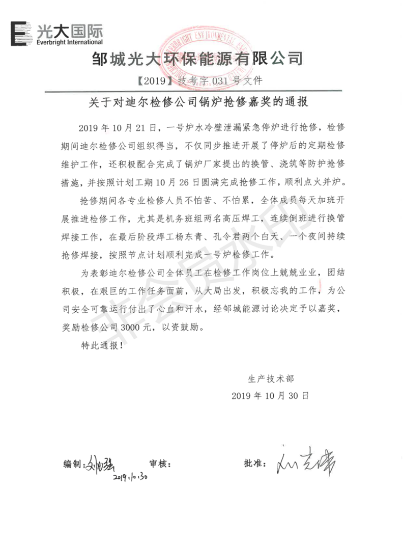 鄒城光大業主對我公司鍋爐搶修給予嘉獎