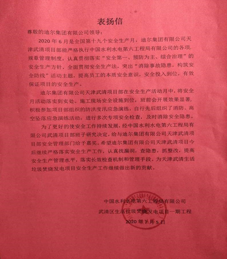天津武清生活垃圾發(fā)電項(xiàng)目“安全生產(chǎn)月”表彰信