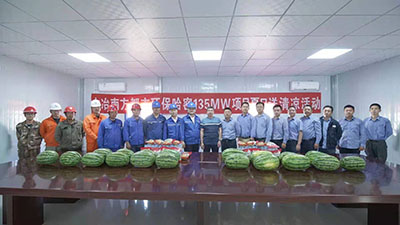 哈密潤達嘉能2×135MW項目切實維護高溫期間廣大職工的身體健康,2021年6月12日上午,總承包方中冶南方都市環保公司工會主席程總、工程部楊部長、營銷部郭部長、項目經理何志剛經理等,為迪爾集團有限公司堅守在崗位的職工送去清涼和問候。