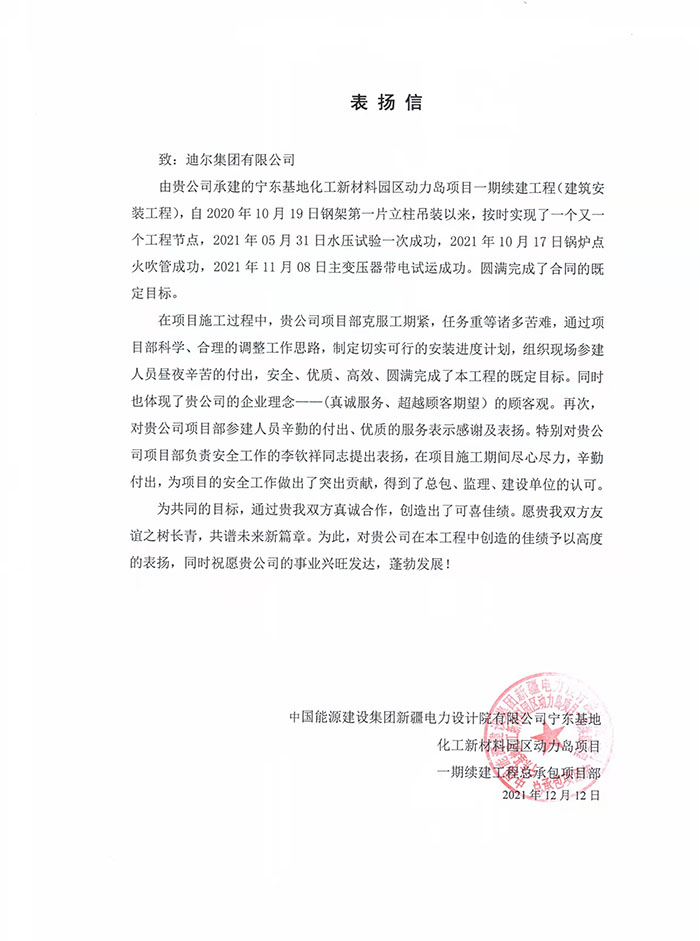 寧東熱電一期續建喜獲表揚信