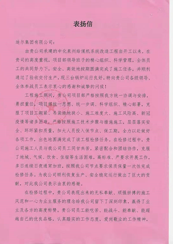 由迪爾集團有限公司一公司承建的中化泉州給煤機系統(tǒng)改造工程于2021年12月9開工,經(jīng)過多日通宵加班,于2022年1月15日最后一臺鍋爐點火成功,標志著檢修任務正式結(jié)束。經(jīng)過一個多月努力,保質(zhì)保量的按期完成了3臺鍋爐給煤機系統(tǒng)改造的檢修任務,得到了中化泉州石化有限公司的肯定,發(fā)來表揚信。