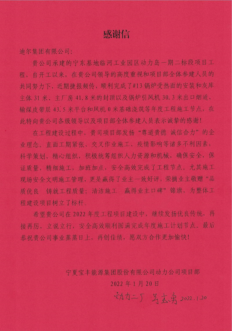 寧東基地臨河工業園區動力島一期二標段項目工程業主感謝信