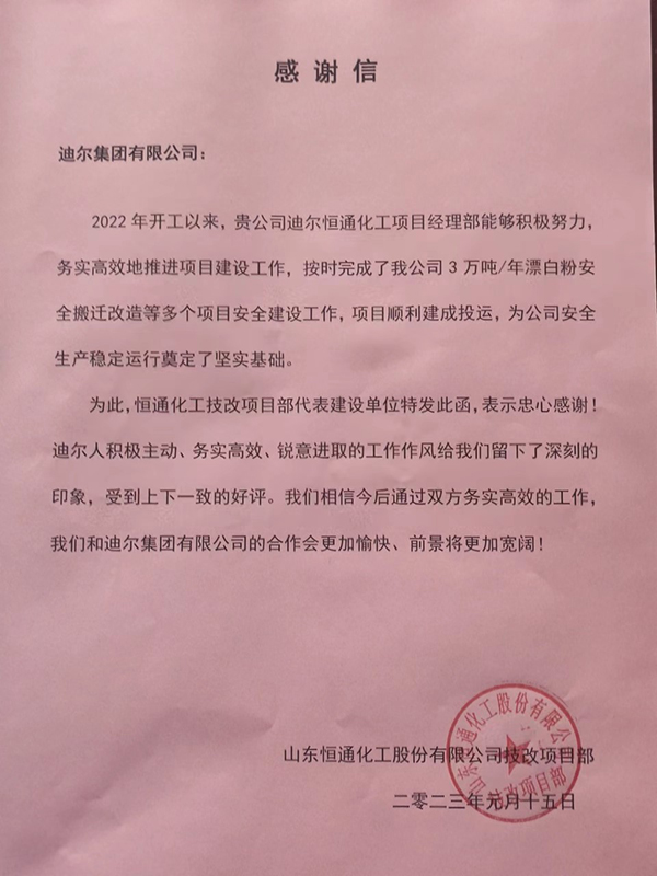 恒通化工技改項目部喜獲感謝信