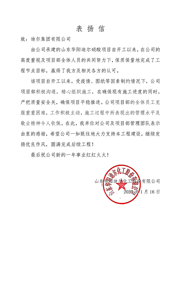 由機電工程分公司承建的山東華陽迪爾硝酸裝置項目,自開工以來,在分公司的高度重視及項目部全體人員的共同努力下,保質保量地完成了工程節點目標,贏得了業主方及相關各方的認可,于1月16日喜獲業主表揚信。