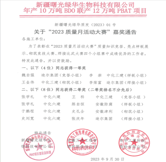 2023年9月30日下午,業主新疆曙光綠華生物科技有限公司聯合監理安徽萬緯工程管理有限責任公司、總包東華工程科技股份有限公司及分包單位共同組織開展了“2023質量月活動大賽”。