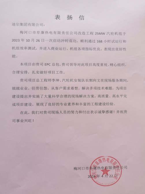 4月22日,梅河口市阜康熱電有限責任公司對山東工程設計院負責設計、施工的梅河口市阜康熱電4號汽輪機低碳節能技改EPC總承包項目給予高度肯定,并發來表揚信。