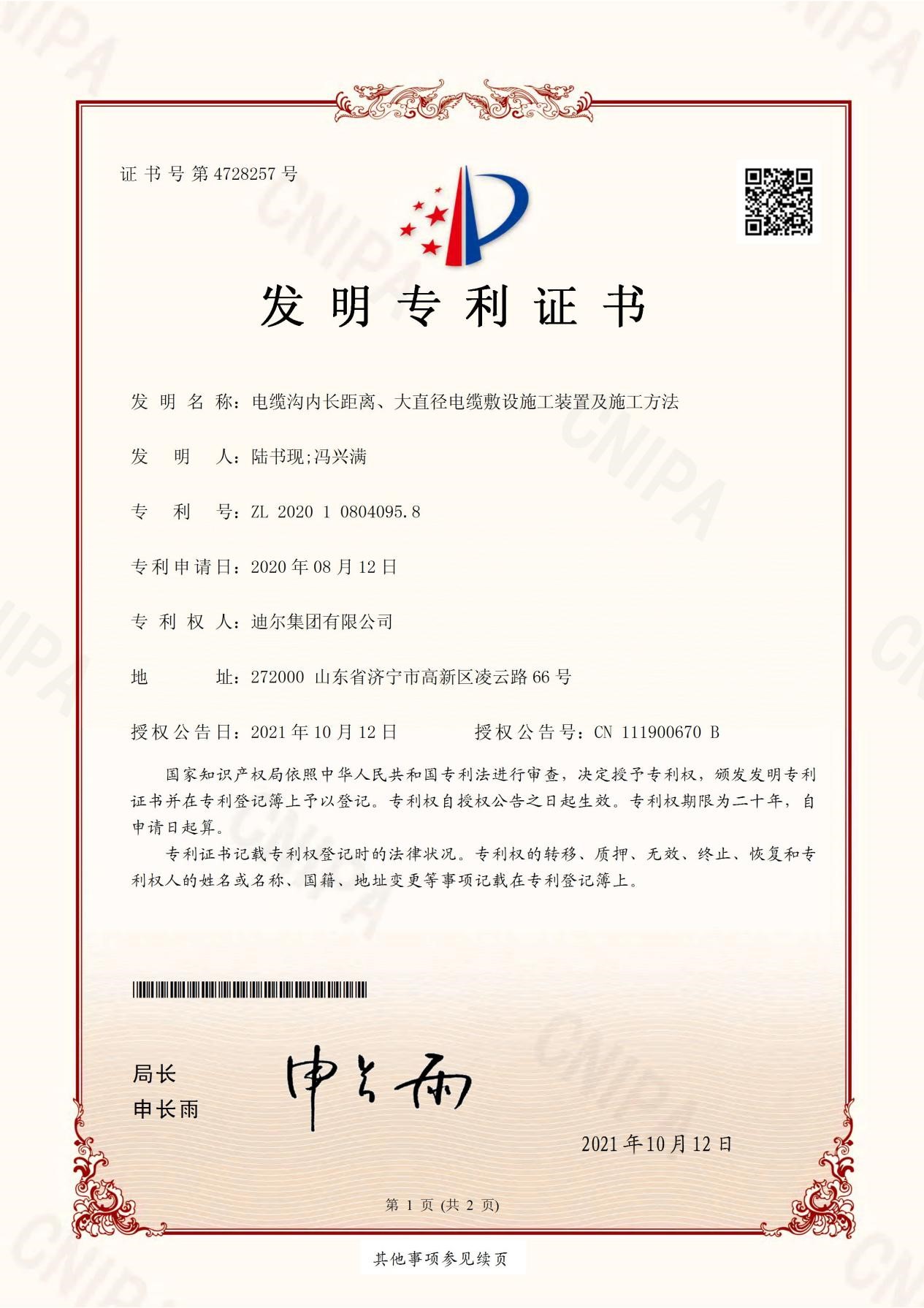 公司榮獲“電纜溝內長距離、大直徑電纜敷設施工裝置及施工方法”發明專利