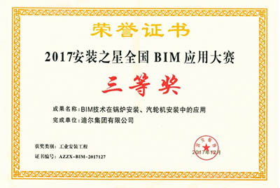 2018年2月,中國安裝協會公示了2017安裝之星全國BIM應用大賽獲獎名單,公司參賽成果《BIM技術在鍋爐安裝、汽輪機安裝中的應用》從135個主申報單位的268個參賽作品中脫穎而出,榮獲本次大賽三等獎。