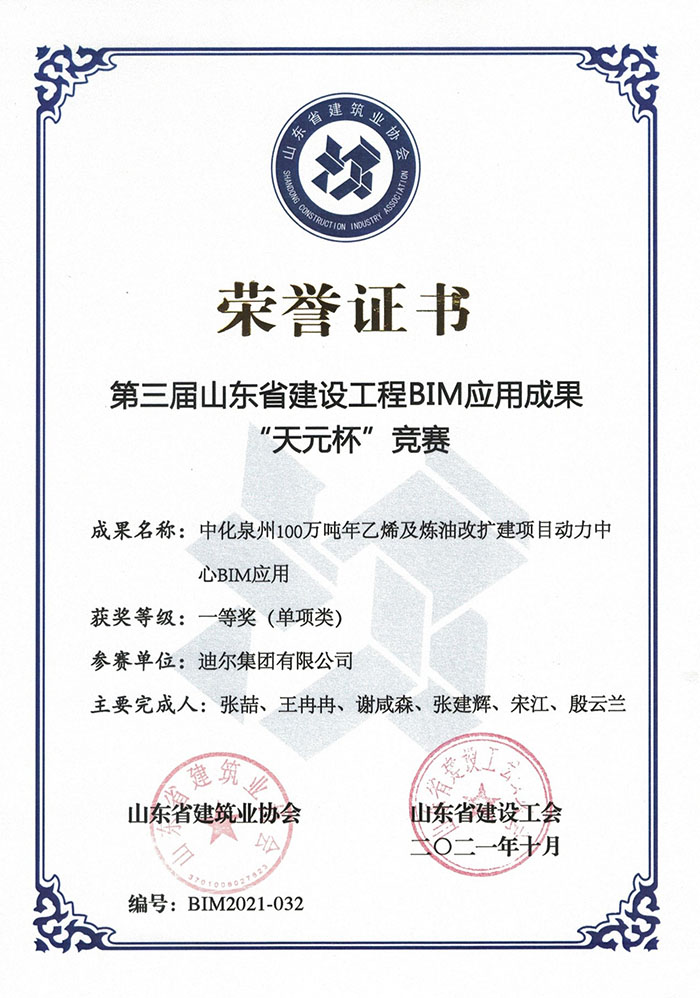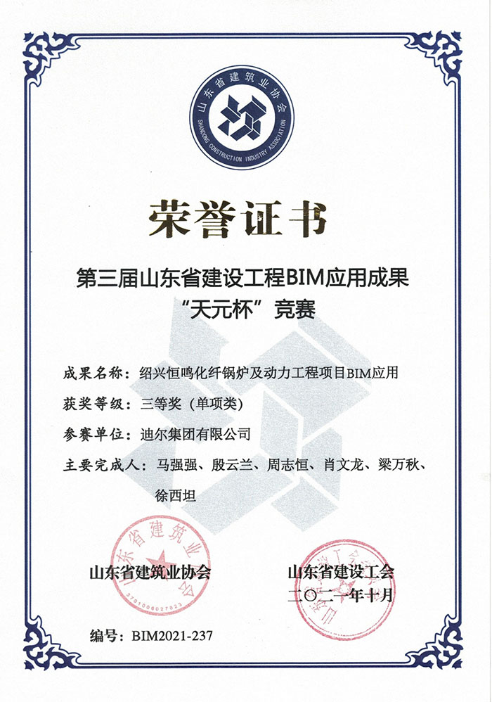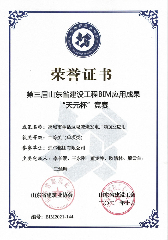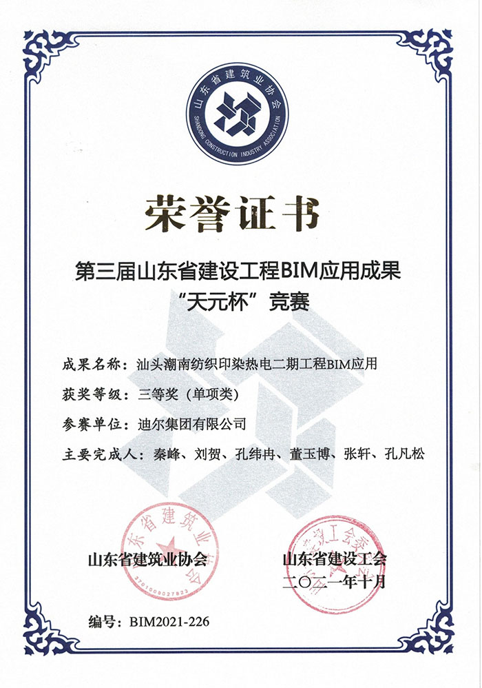 山東省建設工程BIM應用成果“天元杯”競賽由山東省建設工會和山東省建筑業協會聯合舉辦,旨在促進BIM技術在我省建筑行業廣泛深入應用,培養高水平BIM技術應用人才,加快BIM技術的自主創新和工程實踐。迪爾集團堅持智慧建造和綠色發展,時刻踐行“做社會進步的智造者”的社會性理念。此次榮譽的取得,是對公司自主創新能力的進一步肯定,公司將在今后的發展道路中,再接再厲,不斷提升BIM技術深化應用能力,為BIM技術在工程建設領域的推廣做出更大貢獻。