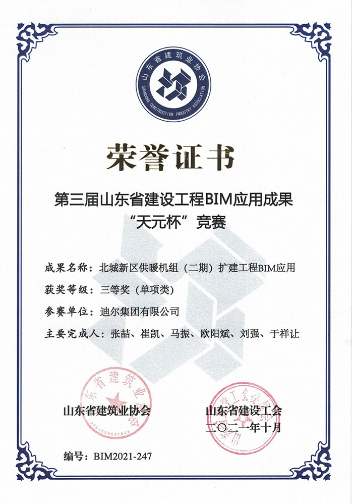 近日,山東省建筑業協會、山東省建設工會聯合發布了魯建協【2021】43號《關于公布第三屆山東省建設工程BIM應用成果“天元杯”競賽獲獎名單的通知》。迪爾集團有限公司經專家評審、終評答辯和公示等環節,最終獲得一等獎1項、二等獎1項、三等獎3項的優異成績。