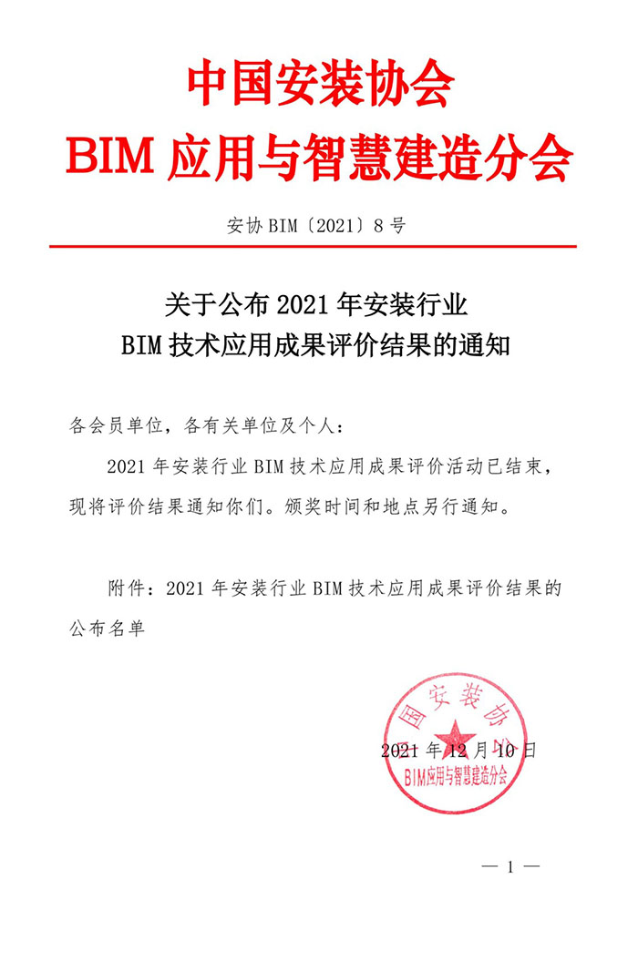 近日,中國安裝協會發布了《關于公布2021年安裝行業BIM技術應用成果評價結果的通知》。公司兩個應用成果經專家評審、終評答辯和公示等環節,最終獲得I類成果1項、II類成果1項的優異成績,達近年來最好水平。