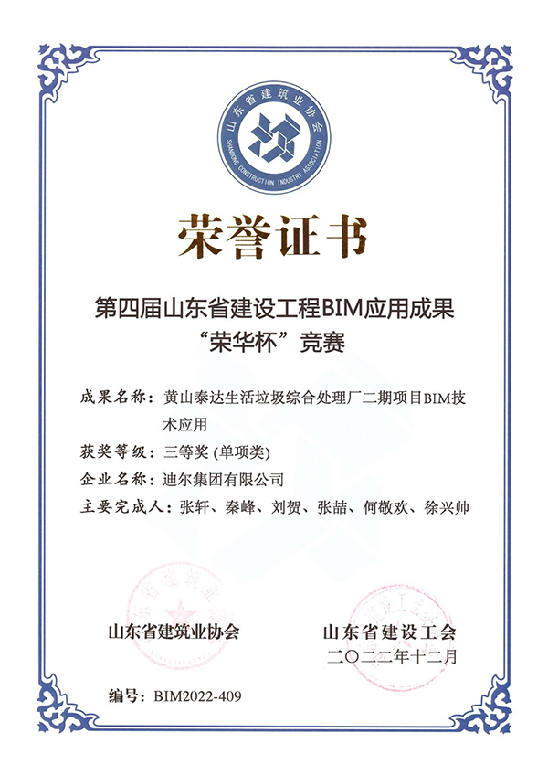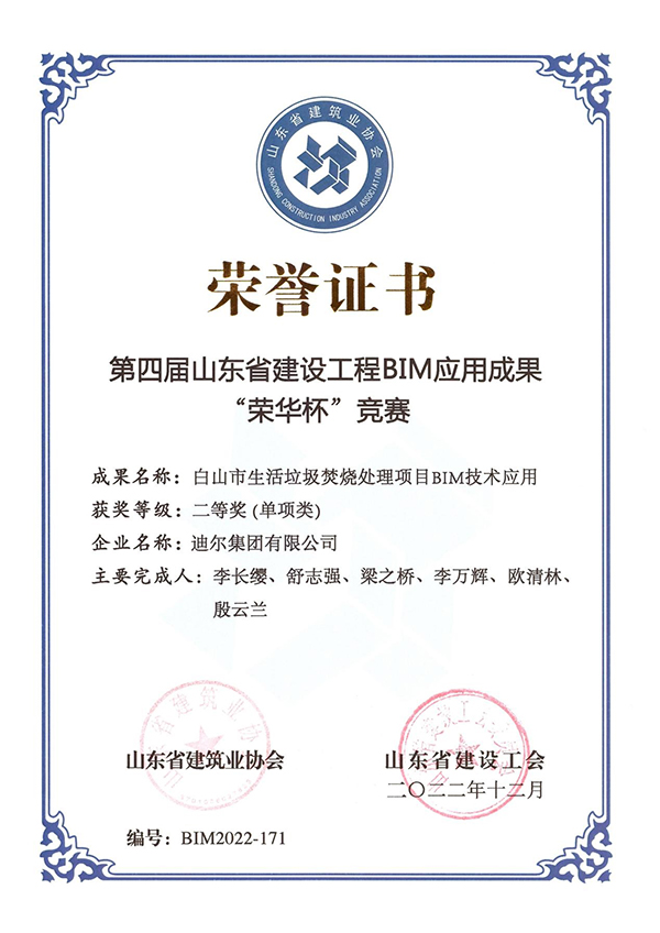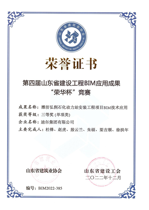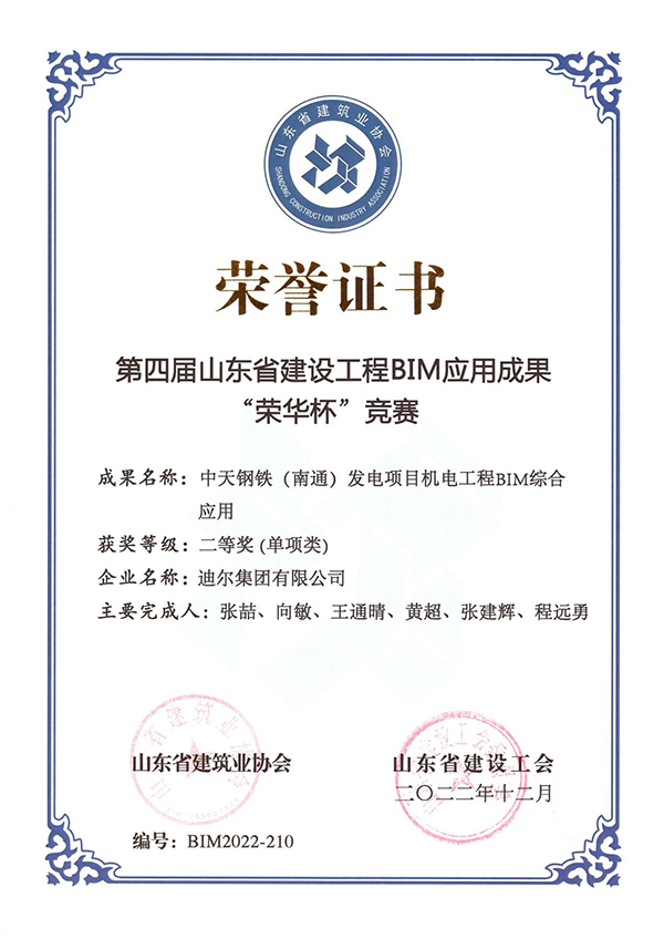 近日,由山東省建筑業(yè)協(xié)會(huì)、山東省建設(shè)工會(huì)聯(lián)合主辦的第四屆山東省建設(shè)工程BIM應(yīng)用成果“榮華杯”競(jìng)賽結(jié)果評(píng)獎(jiǎng)揭曉,迪爾集團(tuán)有限公司經(jīng)專(zhuān)家評(píng)審、終評(píng)答辯和公示等環(huán)節(jié),最終獲得二等獎(jiǎng)2項(xiàng)、三等獎(jiǎng)2項(xiàng)的優(yōu)異成績(jī)