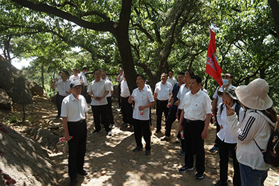 5日早7時,一行人乘車前往山東省蒙陰縣東南與沂南縣西部交界之處的英雄孟良崮主題公園景區。孟良崮同名主峰海拔536米,最高峰大庵頂海拔575.2米,系沂蒙山區“七十二崮”之一,傳說因北宋抗遼名將孟良曾屯兵于此而得名,并于1947年孟良崮戰役后聞名中外。抵達后,在當地導游的帶領和解說下,大家對孟良崮戰役遺址進行了參觀。戰役遺址地處蒙陰縣城東南28公里處,1947年5月中旬,華東野戰軍在這里舉行了震驚中外的孟良崮戰役,一舉殲滅國民黨精銳部隊整編第七十四師。隨后,一行人在蘆山大崮頂“孟良崮戰役紀念碑”前合影留念。“孟良崮戰役紀念碑”高20米,造型如三把刺刀直指藍天,象征著解放軍、地方武裝和民兵三大兵力所向無敵。