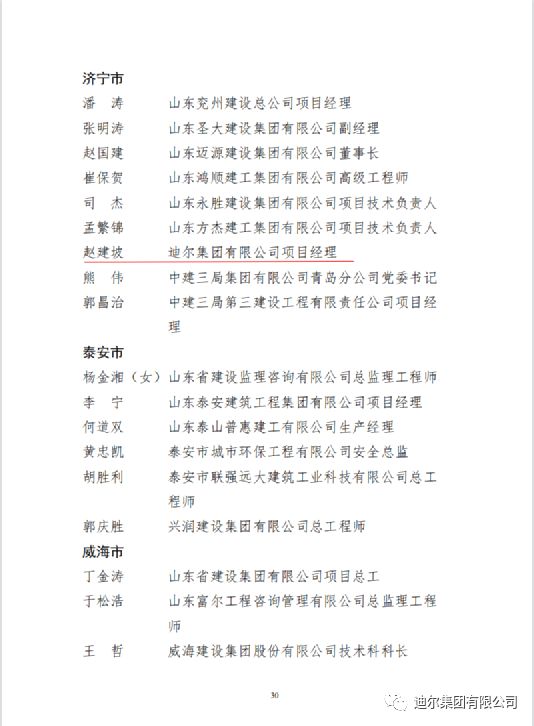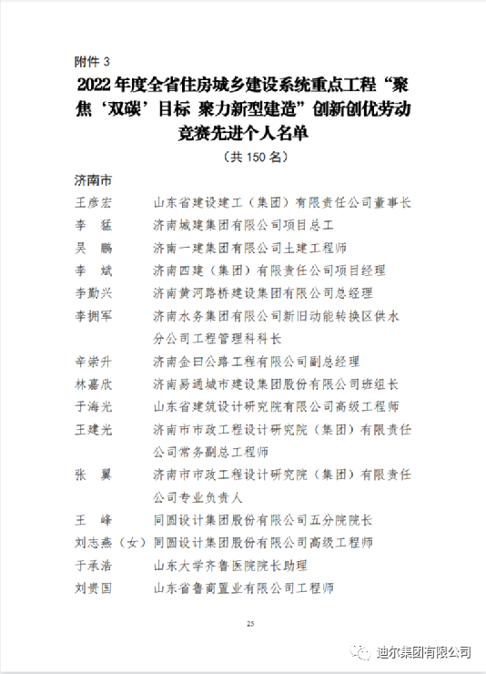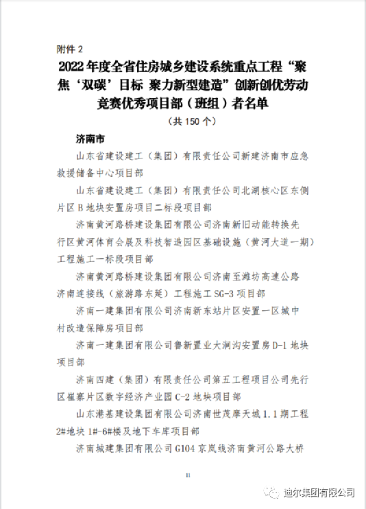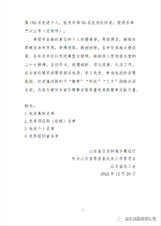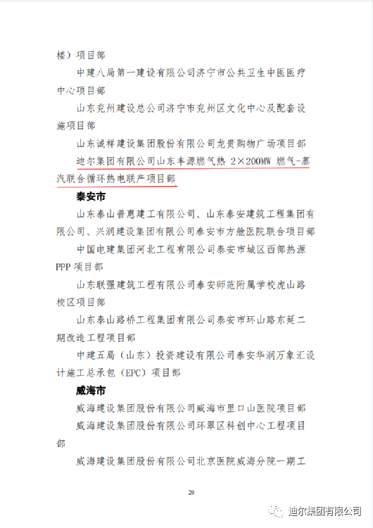 2022年12月28日,山東省住房和城鄉建設廳、中共山東省委省直機關工作委員會、山東省總工會聯合發布文件,迪爾集團有限公司在 2022年度全省住房城鄉建設系統重點工程“聚焦‘雙碳’目標 聚力新型建造”創新創優勞動競賽中獲評“先進集體”榮譽稱號;迪爾集團山東豐源燃氣熱 2×200MW 燃氣-蒸汽聯合循環熱電聯產項目部獲評“優秀項目部(班組)”榮譽稱號;公司員工趙建坡獲評“先進個人”榮譽稱號。