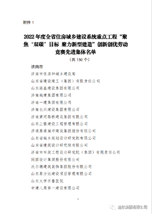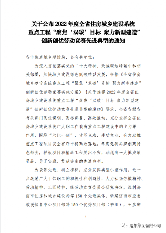 迪爾集團獲評2022年度全省住房城鄉建設系統重點工程“聚焦‘雙碳’目標 聚力新型建造”創新創優勞動競賽“先進集體”榮譽稱號