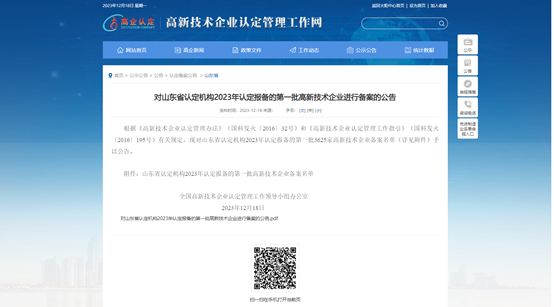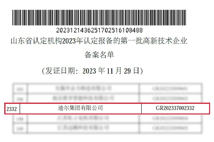 近日,根據國家高新技術企業(yè)認定管理工作網發(fā)布的《對山東省認定機構2023年認定報備的第一批高新技術企業(yè)進行備案的公告》通知,迪爾集團有限公司再次順利通過換證評審,獲得“國家高新技術企業(yè)”認定。