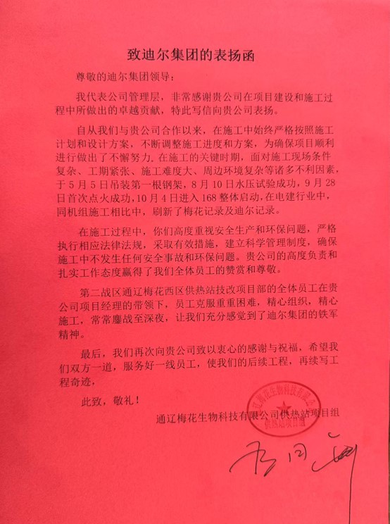 金秋碩果,獻禮國慶。由迪爾集團第二公司承建的通遼梅花西區供熱站技改項目,于2024年9月28日點火一次成功,于10月4日順利進入168小時整體試運行,受到業主的高度贊揚。