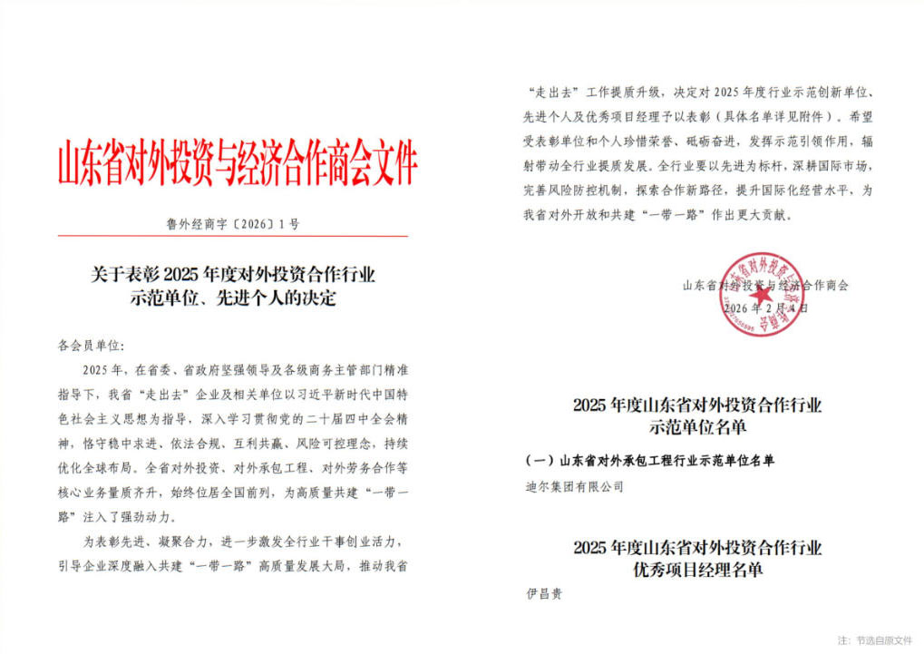 近日,迪爾集團榮獲山東省對外投資與經濟合作商會授予的“2025年度山東省對外投資合作行業示范單位”稱號。與此同時,集團國際戰區伊昌貴同志獲評“2025年度山東省對外投資合作行業優秀項目經理”稱號。